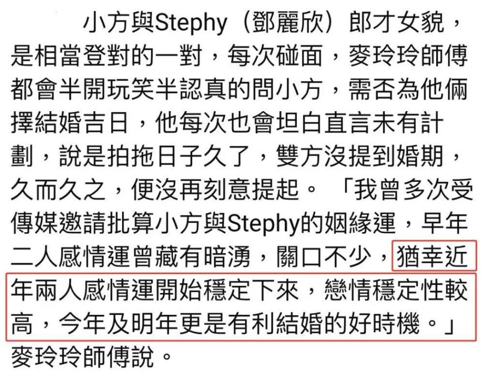 2014年,麦玲玲说方力申和邓丽欣感情稳定,预测他们在2016年结婚,并很快生儿育女。然而,2016年3月,两人就宣布分手。